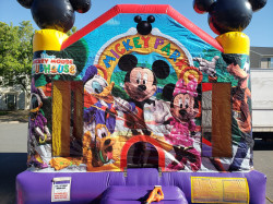 The licensed Mickey Park medium jump will inject your next party or event with a little clubhouse fun, as Mickey and his pals invite everyone to the Mickey Mouse Club House! A pair of trademark, three-dimensional Mickey ears helps show the way, and sharp, colorful artwork makes participants feel they're at Disney! This moonwalk features Mickey, Minnie, Daffy, Daisy, Goofy, and Mickey Mouse's faithful pup, Pluto.