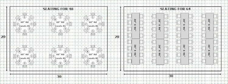 Spacious and Versatile: Measuring 20 feet by 30 feet, our High Peak Tent offers 600 square feet of covered space, accommodating tables, chairs, and plenty of guests comfortably. Its versatile design makes it ideal for various setups, from formal dining to casual reception areas. Seat 48 with 6 round table and chair packages and seat 64 with 8, eight foot table and chair packages. Order an extra table or two for food!